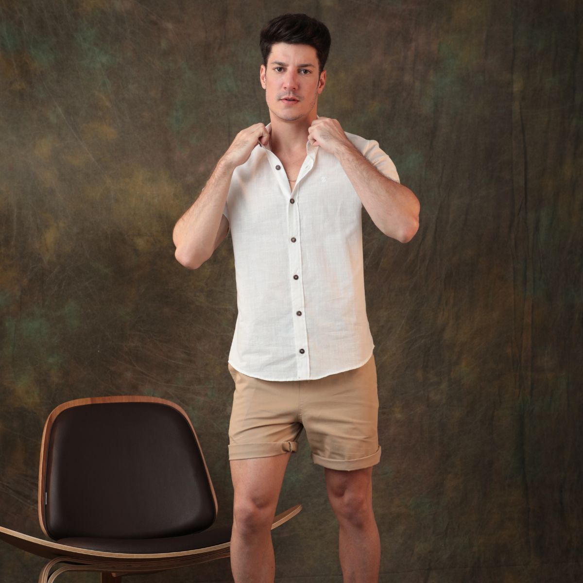 Confeccionada em algodão leve e respirável, a camisa possui modelagem Slim Fit, colarinho Firenze Slim, mangas curtas e fechamento frontal por botões.