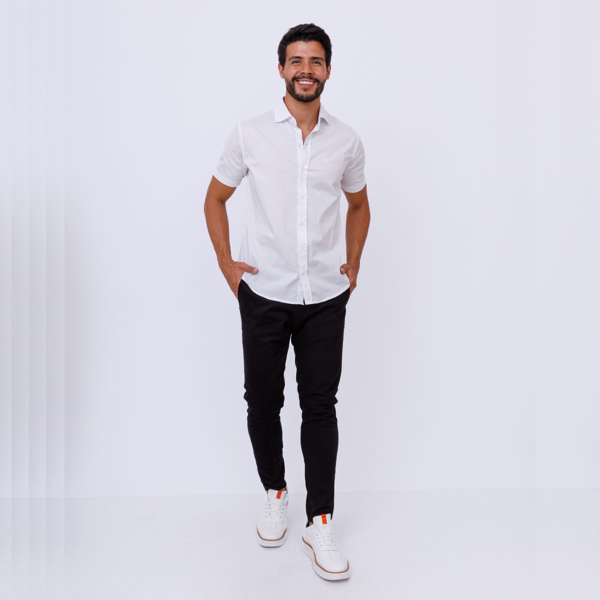 Renove seu visual com esta camisa masculina, uma peça versátil que transita facilmente entre o ambiente de trabalho e momentos de lazer. Confeccionada em tecido plano leve de algodão com elastano, ela oferece um toque agradável e um caimento slim que garante conforto ao longo do dia. Um item essencial para compor looks práticos e com estilo.