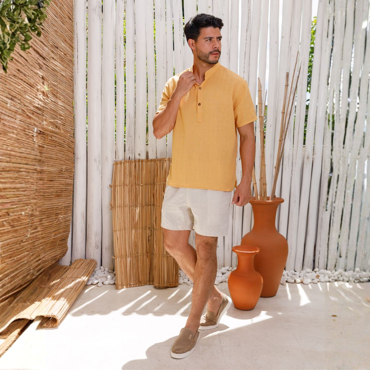 Sugestões de Uso e Combinações Para um visual alinhado e fresco, combine esta bata masculina com calças de sarja ou linho em tons neutros. Se a ocasião for mais descontraída, ela fica ótima com bermudas de alfaiataria e sandálias de couro. Complete o look com um relógio de pulseira de couro para um toque final de sofisticação.