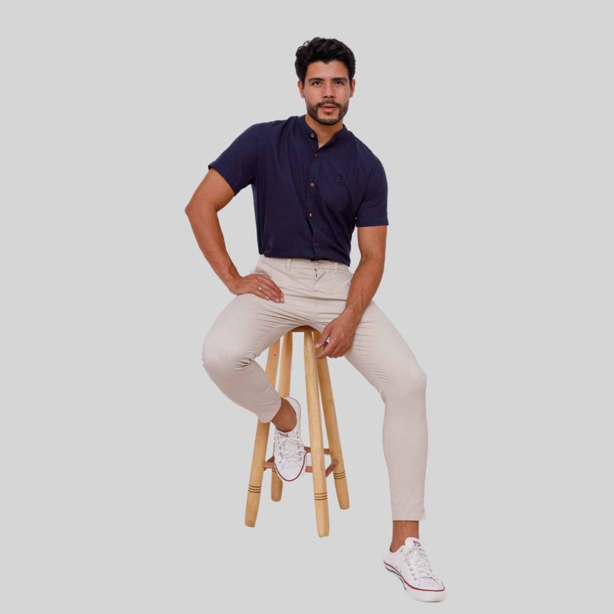 Confeccionada em algodão leve e respirável, a camisa possui modelagem Slim Fit, colarinho gola padre, mangas curtas, e fechamento frontal por botões.
