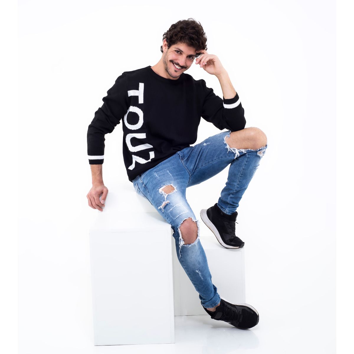 Suéter masculino confeccionado em tricot com gola redonda e mangas longas, detalhe com o nome da marca na vertical, e acabamentos canelados. Peça versátil e confortável, ideal para dias frios.